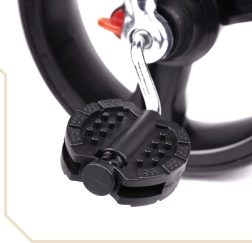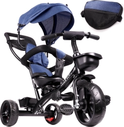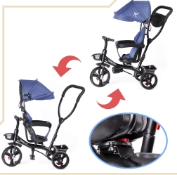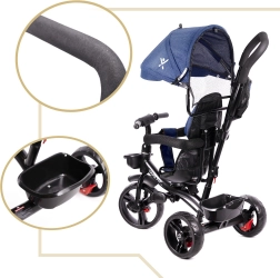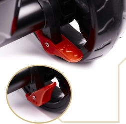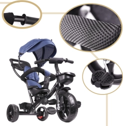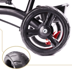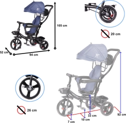 Pour un contrôle maximal, le siège pivotant à 360° permet de rouler face au parent ou dans le sens de la marche. La roue libre autorise le parent à reprendre la propulsion d’un simple interrupteur. Les roues sans chambre à air garantissent le confort des pneus gonflables, sans souci de pression ni risque de crevaison. S’ajoutent une capote pliable en trois positions avec filet, une barre de guidage amovible avec revêtement en mousse et des rangements pratiques.