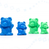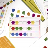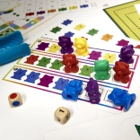 60 petits oursons (6 couleurs), 30 grands oursons (6 couleurs), 6 gobelets en silicone, 3 dés en bois, 2 paires de pinces, 15 cartes recto-verso avec tâches