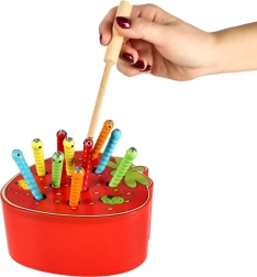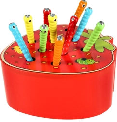Ce jeu magnétique en forme de fraise divertira les enfants pendant de longues heures. Dans le corps de la fraise se cachent 10 chenilles colorées à extrémité métallique que l’enfant attrape et retire à l’aide d’une baguette en bois avec aimant. Une variante plus difficile consiste à replacer avec précision les chenilles à leur place après les avoir attrapées.