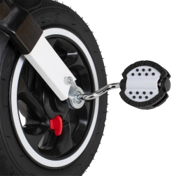 Les grandes roues sans chambre à air à excellente adhérence sont résistantes aux crevaisons et ne nécessitent aucun gonflage. La sécurité est assurée par les freins de stationnement arrière, les ceintures 2 points, l’arceau de protection et les pédales antidérapantes. S’ajoutent une sonnette, une pochette zippée pratique et une capote avec maille pour garder un œil sur l’enfant.