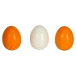 1× boîte alvéolée en carton pour 6 œufs, 6× œufs en bois (3 entiers, 3 avec jaune amovible)