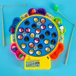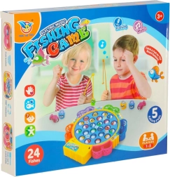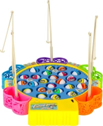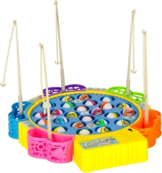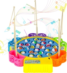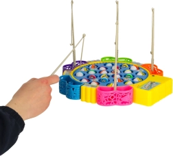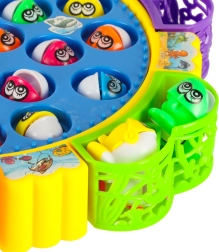 Jeu familial amusant pour 1–5 joueurs, où vous pêchez de petits poissons dans un étang tournant. Un moteur entraîne la plateforme rotative, les poissons ouvrent et ferment la bouche et le jeu joue une mélodie. Inclus: 24 poissons, 5 cannes et une base colorée avec paniers. Développe superbement les réflexes, la coordination œil–main et la concentration.