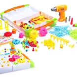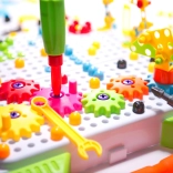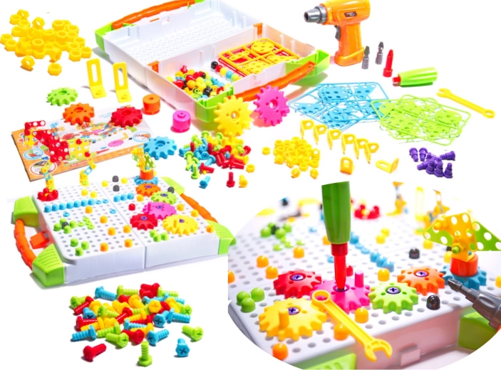 Un ensemble de vis, de connecteurs et de pièces de formes variées et de couleurs vives permet de construire des motifs, des images et de simples structures 3D, et d’apprendre les couleurs et les formes en jouant.