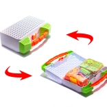 La plaque perforée sert de base de jeu et, une fois le jeu terminé, se transforme en mallette. Les pièces se rangent facilement et vous pouvez les emporter partout.