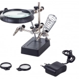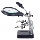 Ce support de montage « troisième main » est un assistant indispensable pour les électroniciens, bijoutiers et maquettistes. La grande loupe 2,5× (90 mm) complétée par deux lentilles additionnelles 7,5× et 10× offre une image claire et nette. L’éclairage LED sur col de cygne flexible illumine la zone de travail exactement où c’est nécessaire.