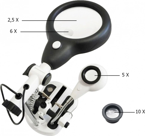 Loupe de travail professionnelle avec éclairage LED intégré et système de « troisième main » pour faciliter toutes les opérations nécessitant une précision maximale. La grande lentille de 10,4 cm avec éclairage et la petite lentille interchangeable permettent un contrôle détaillé, le soudage et le collage de petites pièces.