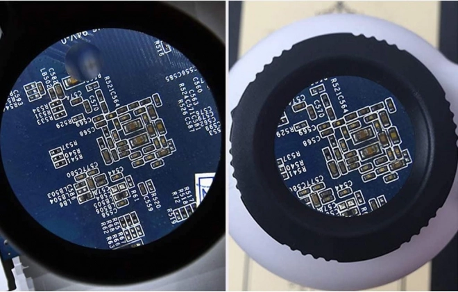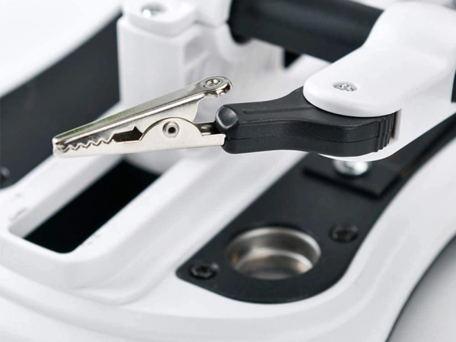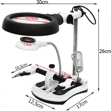 L’éclairage à deux niveaux de luminosité (100 % / 50 %) assure une image claire sans ombres. Les bras flexibles avec pinces crocodile maintiennent fermement les composants, tandis que le support spiralé pour fer à souder et les compartiments de la base gardent l’espace de travail bien organisé.
