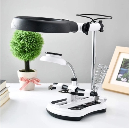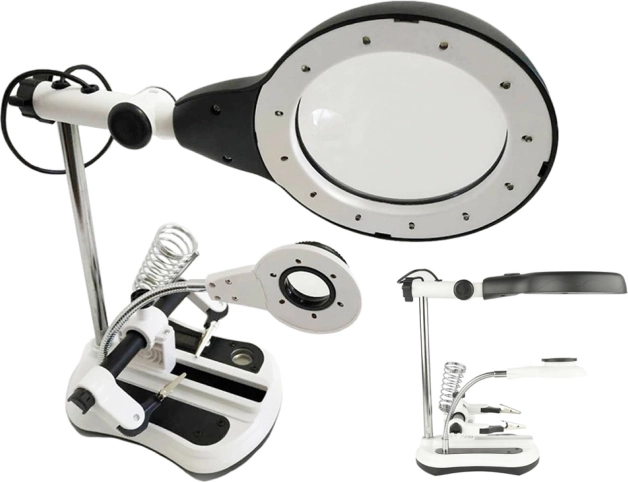 Loupe multifonction avec troisième main pour des travaux de soudage et de réparation précis. Offre un grossissement 2,5x/5x/6x/10x, 12 + 6 LED avec deux modes d’éclairage et une base stable avec organiseurs. Grâce à ses bras réglables, ses pinces crocodile et son support pour fer à souder, elle est idéale pour l’électronique, l’horlogerie et les travaux de modélisme délicats.