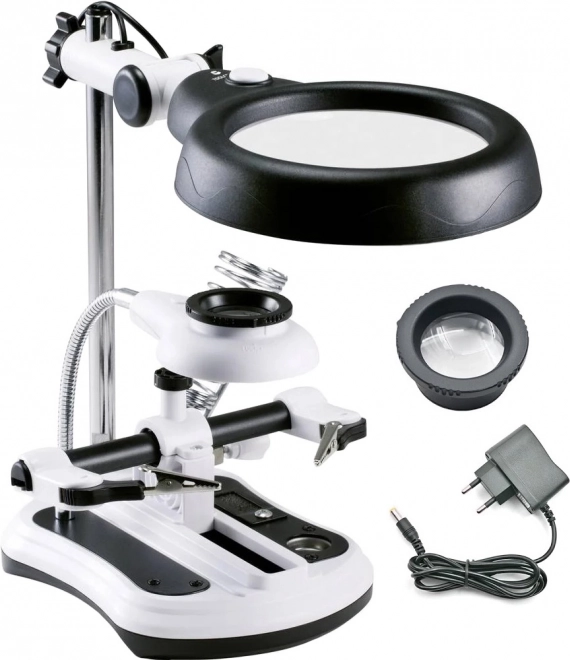 - Loupe avec troisième main, lentille de rechange, adaptateur d’alimentation, chiffon pour verre, emballage d’origine