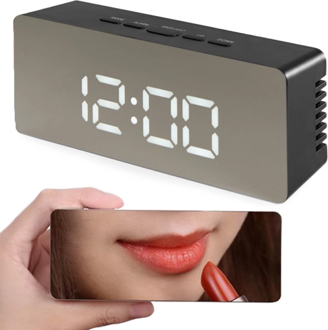 Ce réveil LED stylé allie fonctions pratiques et look moderne. La surface miroir de l’écran permet une vérification rapide de votre apparence, la luminosité est réglable pour ne pas gêner la nuit tout en restant parfaitement lisible le jour. L’affichage LCD clair indique l’heure au format 12/24 h, la date et la température en °C ou °F.