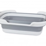 Pratique bassin pliant en silicone avec vidange, idéal pour la lessive, le ménage et le camping. Grâce à sa hauteur de seulement 7,5 cm une fois plié, il économise de la place, offre un volume d’environ 40 L, une évacuation avec bouchon étanche et des poignées et pieds antidérapants en plastique et silicone résistants.