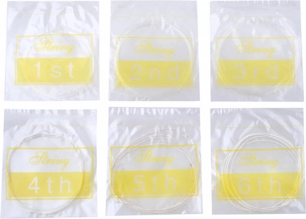 L'ensemble de six cordes en nylon est conçu pour les guitares classiques et contient les tailles suivantes : 0,28 \ 0,29 \ 0,32 \ 0,35 \ 0,40 \ 0,43. Trois cordes ont un enroulement argenté, tandis que les trois autres n'ont pas de housse transparente. L'ensemble entier est universel pour tout type de guitare classique et est livré dans une pochette transparente compacte, facile à ranger.