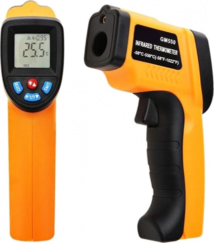 Pyromètre infrarouge sans contact pratique pour une mesure de température rapide et précise de −50 à +550 °C. Grâce au pointeur laser, vous visez facilement la zone à mesurer, même dans les endroits difficiles d’accès. L’appareil offre un écran LCD rétroéclairé, le changement d’unités °C/°F, une émissivité réglable et les fonctions MAX/AVG/MIN, y compris un alarme de température haute et basse.