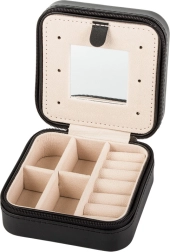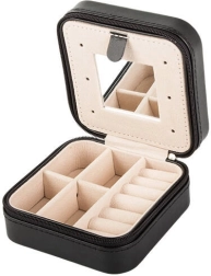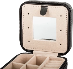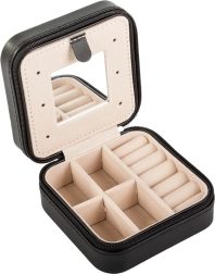 Cette boîte à bijoux élégante, avec extérieur noir et intérieur en velours beige, est idéale pour un usage quotidien comme pour les voyages. Son agencement clair permet de ranger bagues, boucles d’oreilles, colliers et petits accessoires, tandis que le miroir intégré aide à peaufiner votre look en un instant.