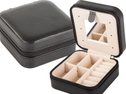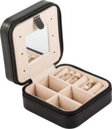 Élégante boîte à bijoux de voyage aux dimensions compactes, elle protège et organise parfaitement vos bijoux à la maison comme en déplacement. Elle offre plusieurs compartiments, un espace rembourré pour bagues, des crochets pour colliers et un miroir pratique. Grâce à sa fermeture éclair, vos accessoires restent en sécurité et le velours intérieur doux évite les rayures.