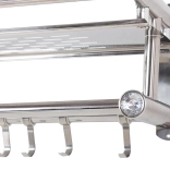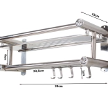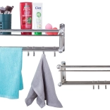Élégante étagère murale de salle de bain de couleur argentée combinant une surface de rangement spacieuse, deux barres à serviettes et quatre crochets pratiques. Sa structure en aluminium, légère et résistante, est idéale pour un usage quotidien et, grâce à son design universel, s’intègre aux intérieurs modernes comme classiques.