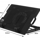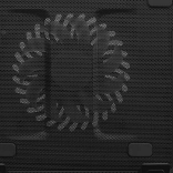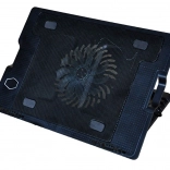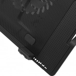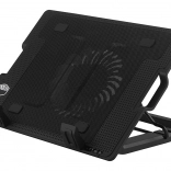 Un grand ventilateur de 12 cm assure un flux d’air stable et un fonctionnement silencieux. Le rétroéclairage LED bleu indique le refroidissement actif et confère au support un look moderne.