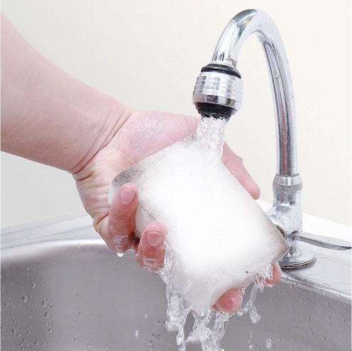 Facile à utiliser, elle est idéale pour le nettoyage quotidien sans produits chimiques supplémentaires. Les dimensions de l’éponge sont 14 cm x 9 cm x 4 cm et elle est disponible en blanc.