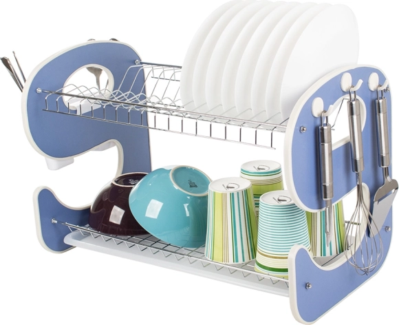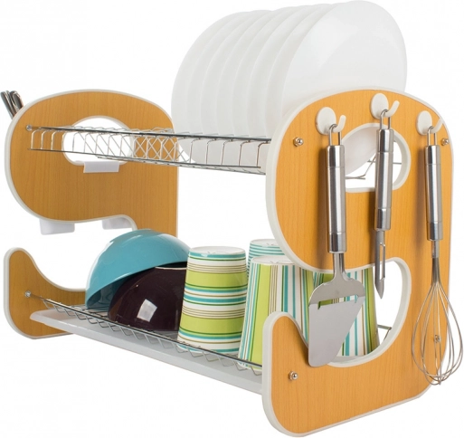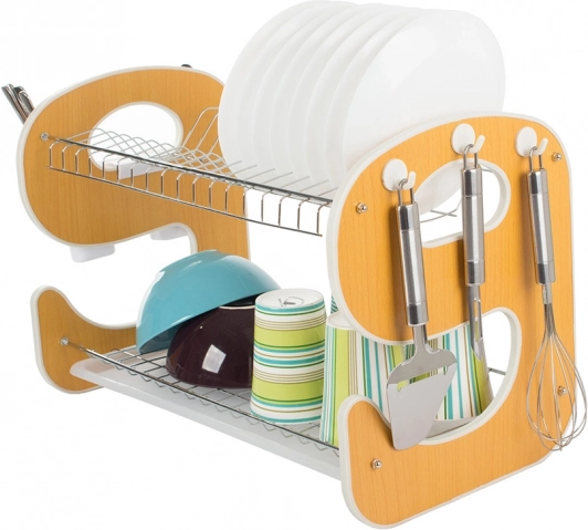 Pratique, l’égouttoir à vaisselle à deux niveaux avec plateau d’égouttage maintient votre cuisine parfaitement ordonnée. Il offre une construction stable, une capacité jusqu’à 14 assiettes, 2 niveaux de séchage pour assiettes, bols et tasses, ainsi qu’un organiseur suspendu pour couverts avec crochets pour accessoires de cuisine. La combinaison de métal et de plastique résistant assure une longue durée de vie et une résistance à l’humidité.