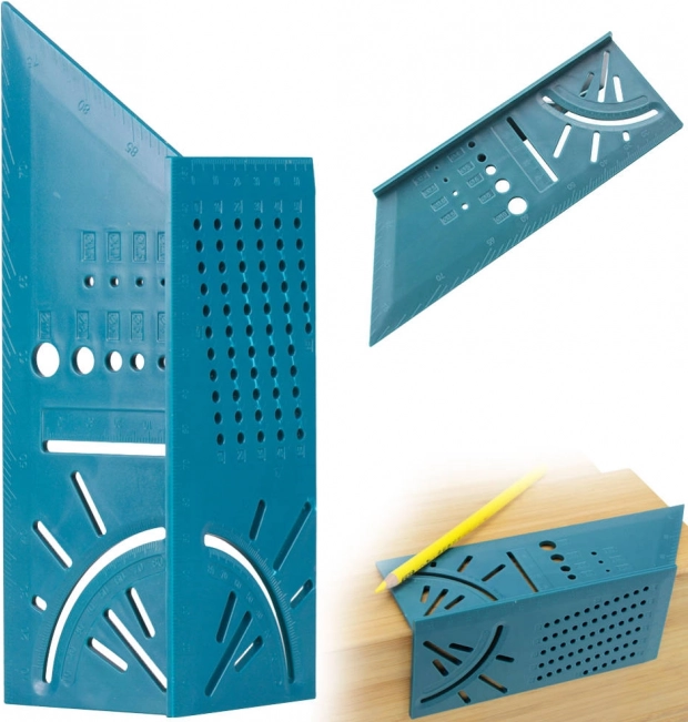 Équerre japonaise 3D pratique pour menuisiers, charpentiers et bricoleurs, combinant les fonctions de rapporteur, règle et jauge de forets. Permet un traçage et un mesurage d’angles rapides et précis, le report de cotes et le marquage sur coins et tuyaux. Conception plastique légère de couleur bleue, durable et facile à transporter.