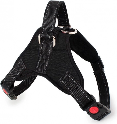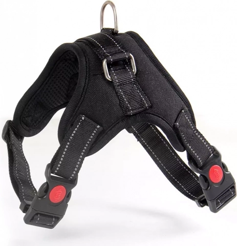 La conception du harnais répartit la traction sur toute la surface du thorax, protégeant ainsi la colonne vertébrale et les voies respiratoires. Le rembourrage minimise les frottements et augmente le confort même lors de longues promenades.
