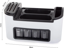 Simplifiez l’organisation de votre cuisine avec cet organiseur pratique. Il offre une conception à plusieurs niveaux, garantissant un accès facile à tous les objets nécessaires. Sur le niveau supérieur, vous rangez aisément vos épices préférées, bocaux ou bouteilles. Sur les côtés, un espace est prévu pour des ustensiles de cuisine tels que couteaux, fourchettes ou spatules.