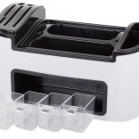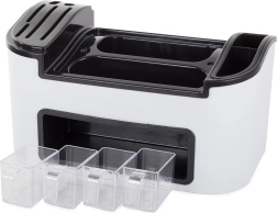 La partie inférieure de l’organiseur comprend quatre tiroirs spacieux en plastique transparent esthétique, idéaux pour ranger café, thé ou sucre. Chaque élément de l’organiseur est facilement amovible pour un nettoyage en profondeur et la base sert d’égouttoir pour assurer le séchage.