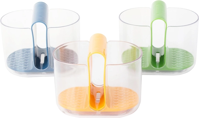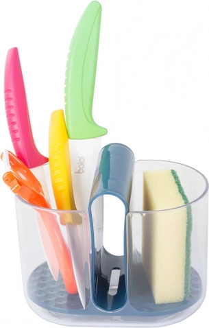 Les compartiments latéraux sont destinés aux couverts, tandis que le compartiment central est idéal pour le lave-vaisselle. Les trous intégrés permettent à l'eau des couverts de s'écouler vers le fond, assurant un séchage rapide. Cet égouttoir est facilement amovible, ce qui facilite la vidange et l'entretien.