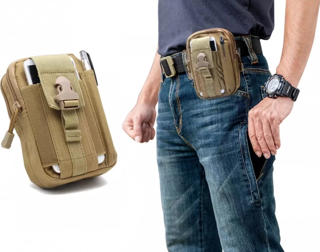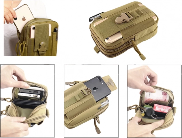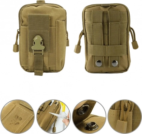 Étui de ceinture tactique compact avec système MOLLE, idéal pour la randonnée, le camping et l’usage quotidien. Il offre 2 compartiments principaux zippés, plusieurs poches pour une organisation claire et un support frontal pour téléphone avec sangle réglable. Le matériau résistant et imperméable ainsi que les coutures solides protègent vos effets, tandis que l’intérieur rembourré absorbe les chocs. Peut se fixer à une ceinture, un sac à dos ou un mousqueton.
