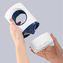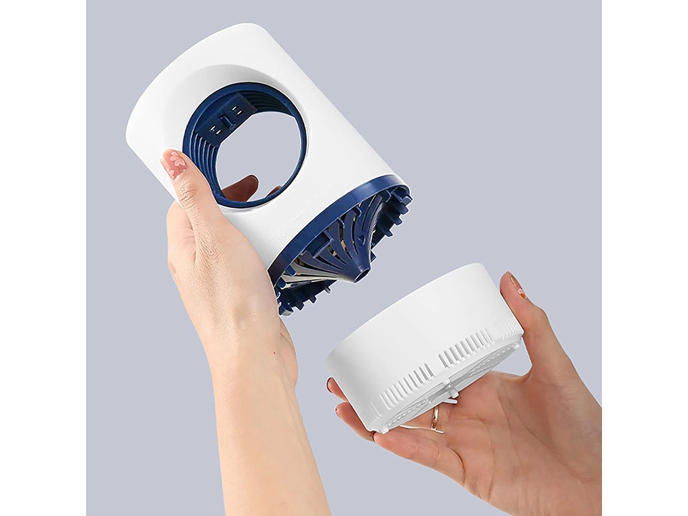 Le récipient collecteur amovible permet un nettoyage rapide et hygiénique sans contact direct avec les insectes. L’alimentation USB offre une grande flexibilité d’installation – une simple powerbank, un adaptateur ou un port USB suffit. Son design élégant en blanc et bleu foncé s’intègre dans tout intérieur.